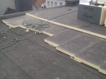 De meest gebruikte en efficiënte methode voor platte daken. Hierbij wordt de isolatie bovenop de draagvloer geplaatst, onder de waterdichte daklaag.